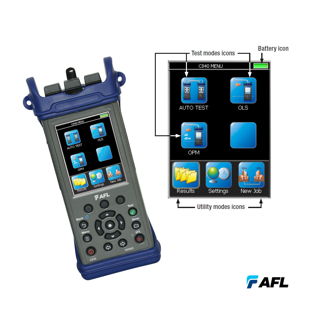 Das AFL NOYES C840 ist ein glasfaserzertifizierungs Dämpfungsmessgerät mit Touch and Test©, einer intuitiven visuellen Benutzeroberfläche sowie Pass-/Fail-Anzeigen und AFLs TRM LWL-Bericht Software. Die einfache benutzerfreundliche Oberfläche vereinfacht und reduziert Einarbeits- und Trainingszeit sowie Testfehler bei unerfahrenen Technikern.