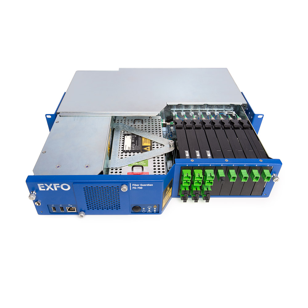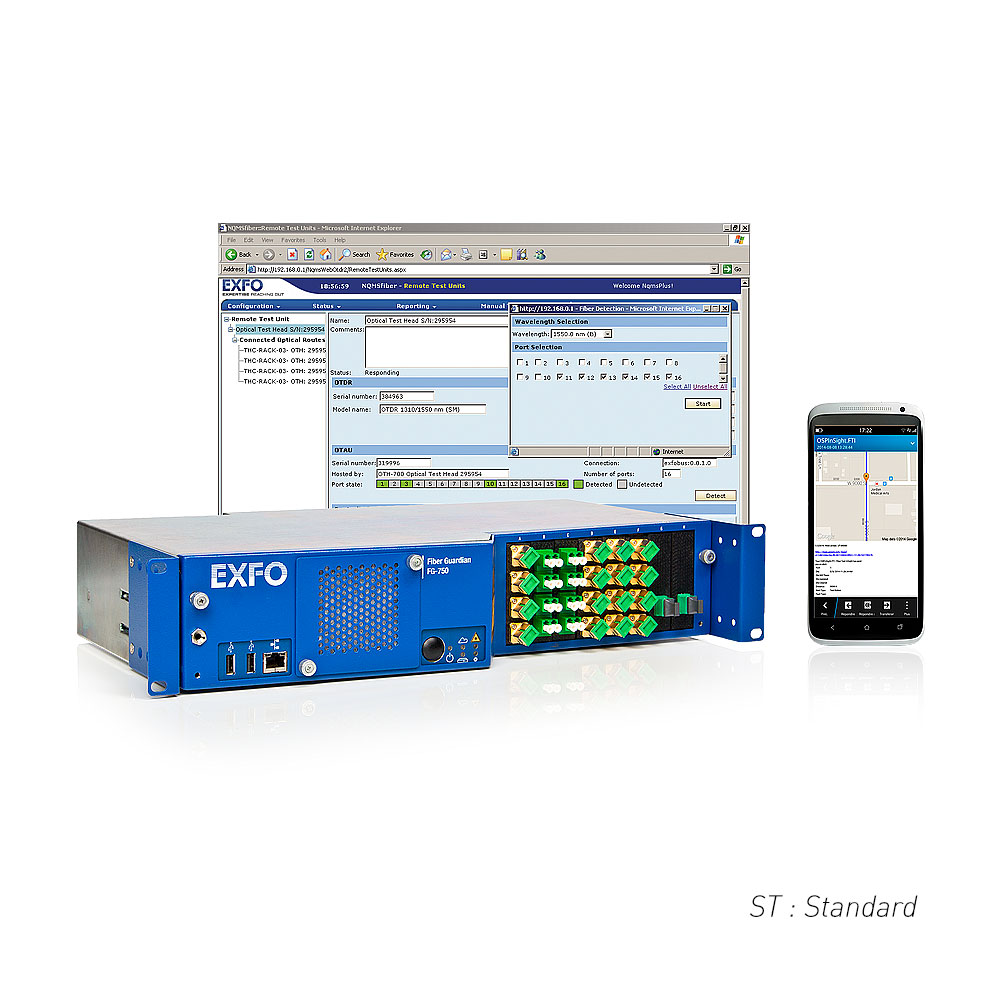 Der Fiber Guardian 750ST ACOR bietet abgesetztes Monitoren über das standardisierte Web-Interface und interaktives Messen mit dem integrierten OTDR (43 dB Bereich mit einer oder mehreren Wellenlängen) sowie Umschalter (über 24 Ports mit 4, 8 oder12 Port-Kassetten).