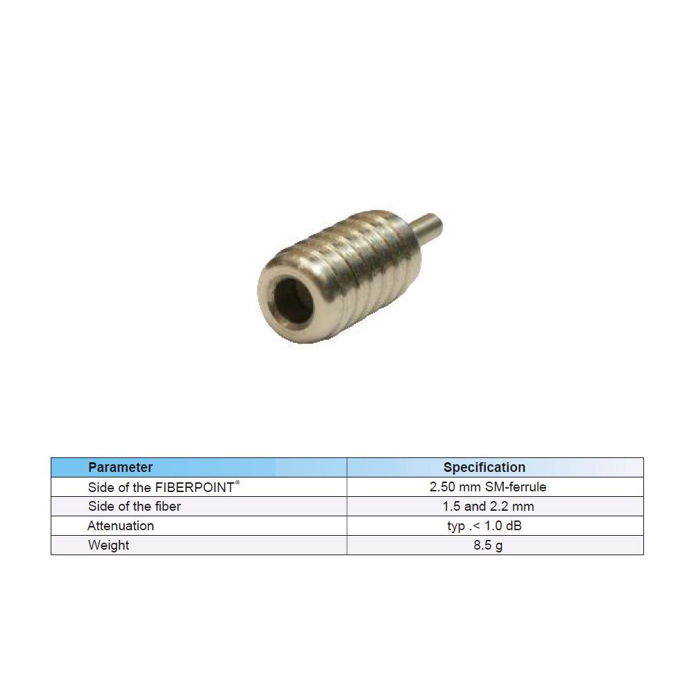 Passend für die patentierte 2,50 mm FIBERPOINT-Verbindung zu einem 1,5- und 2,2 mm Außendurchmesser Polymer-Glasfaser-Anschluss. Folglich können Sie somit beide gängigen Faserverbindertypen mit einem Faser-Fehlerortungsgerät überprüfen.