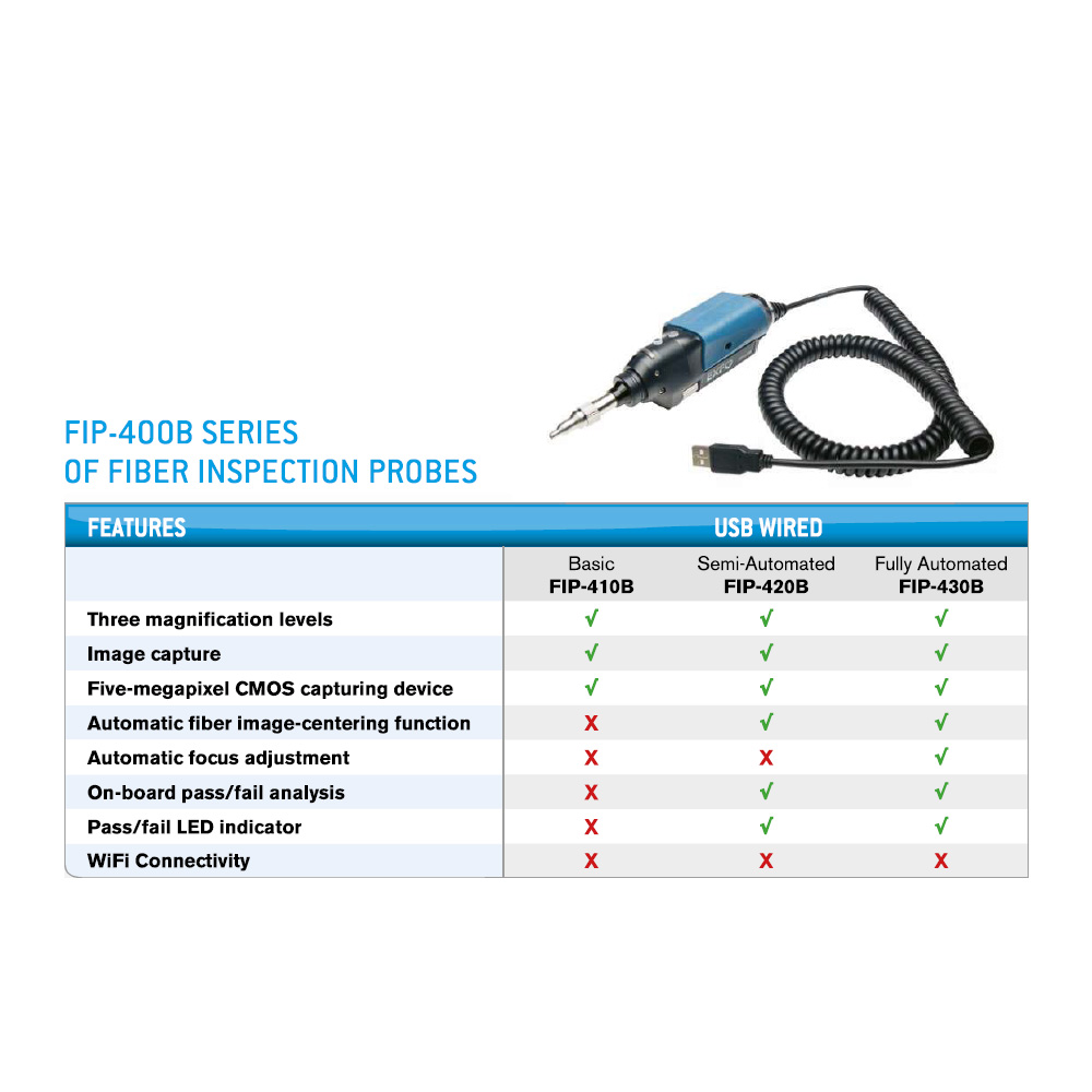 FIP 430B: Dieses kabelgebundene Digital Video Mikroskop ist über USB 2.0 an Computer und EXFO-Messgeräte anschließbar, auf denen die ConnectorMax Software installierbar ist. Die FIP bietet 3 Vergrößerungsstufen. Die Fokussierung geht sehr einfach von der Hand dank des ideal positionierten Fokusrads.