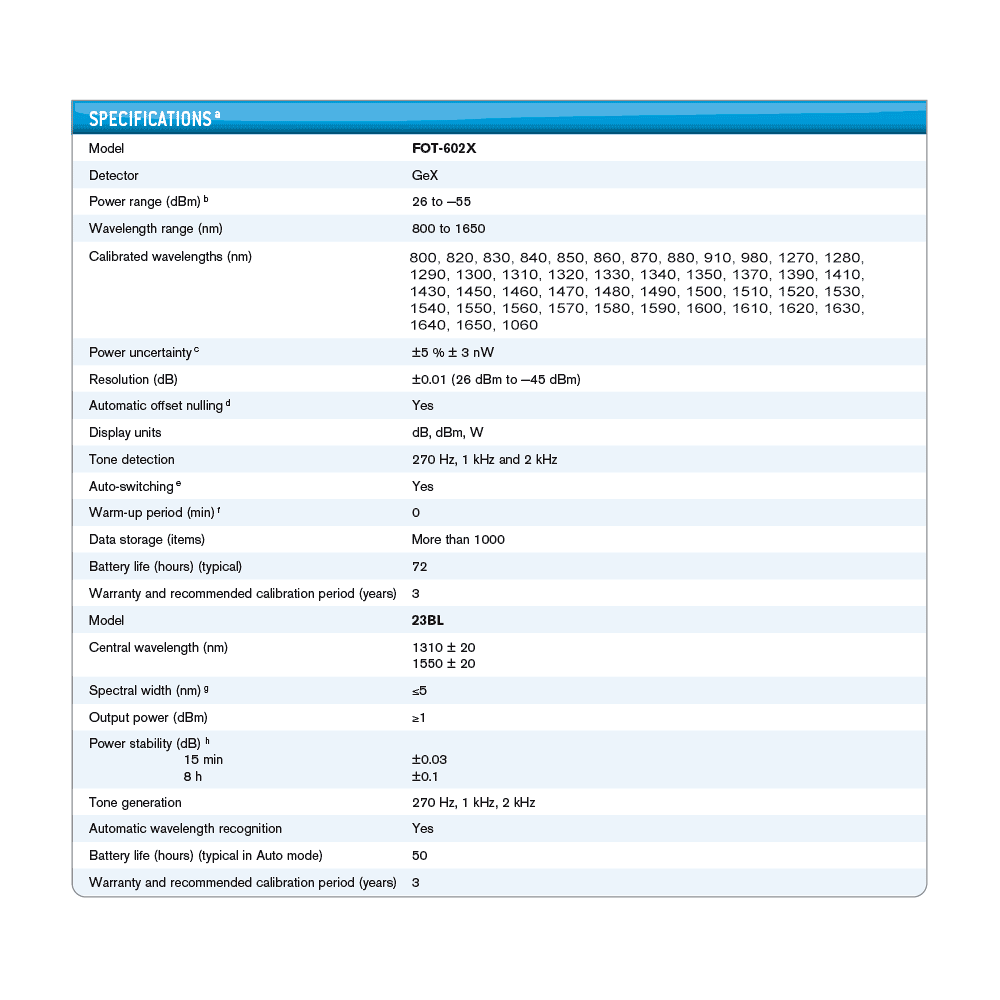 Das FOT-602X bietet OK/Fehler-Testfunktionen, einstellbare anwenderdefinierte Schwellwerte und Speicherplatz für mehr als 1000 Datensätze. Weiter punktet es mit 40! kalibrierten Wellenlängen (nm): 800, 820, 830, 840, 850, 860, 870, 880, 910, 980, 1270, 1280, 1290, 1300, 1310, 1320, 1330, 1340, 1350, 1370, 1390, 1410, 1430, 1450, 1460, 1470, 1480, 1490, 1500, 1510, 1520, 1530, 1540, 1550, 1560, 1570, 1580, 1590, 1600, 1610, 1620, 1630, 1640, 1650, 1060.
