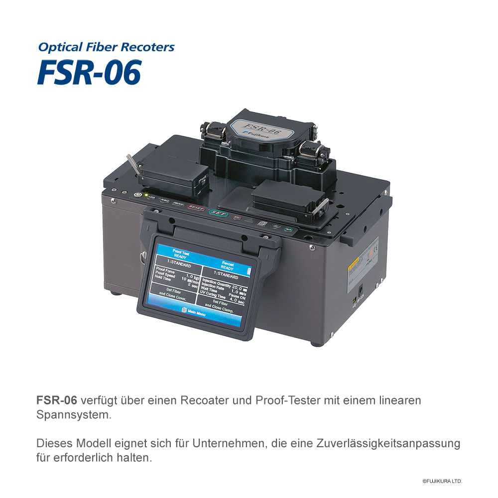Die Fujikura LWL Recoater-Familie FSR-05, FSR-06 und FSR-07 bietet hochwertige blasenfreie Recoatings für Endmaße von 195µm bis 1000µm. Unterschiede bestehen in erster Linie in den Zugtesteigenschaften. Das Haupteinsatzgebiet sind Factory-Umgebungen. Für Fasern mit 100 - 900 µm Beschichtungsdurchmesser bietet der FSR-06 eine hochwertige Wiederbeschichtung mit einer hochpräzisen Glasquarzform.