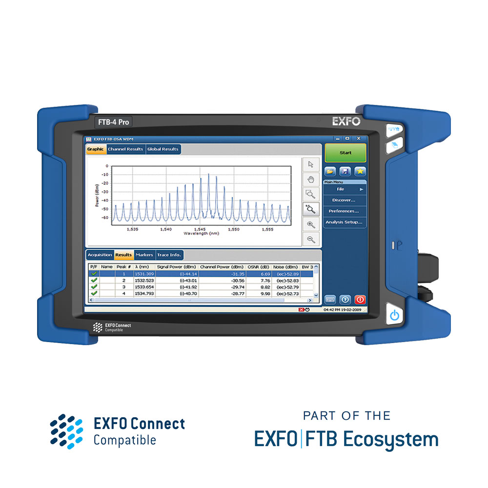 EXFOs neue 4-Slot Plattform bietet sowohl Unterstützung für die älteren FTB-Modulbaureihen von OTDR, OSA, CD/PMD und Transport/Datacom als auch für neue FTBx-Module für unterschiedliche Anwendungen – damit ist diese Plattform die flexibelste Lösung für alle, die bereits Module besitzen und/oder Messungen über mehrere Layer durchführen müssen. Welche Module im Einzelnen unterstützt werden, entnehmen Sie bitte dem Datenblatt.