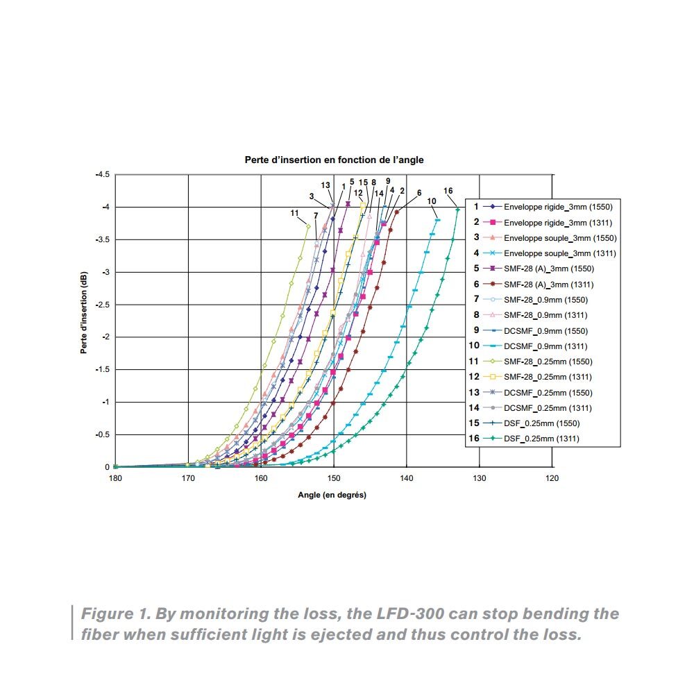 Der LFD-300B FiberFinder liefert einen einzigartigen Ansatz: der Leistungsverlust wird überwacht, wenn der Winkel geändert wird. Somit wird der Winkel automatisch für jeden Fasertyp und jede einzelne Modenwellenlänge optimiert.