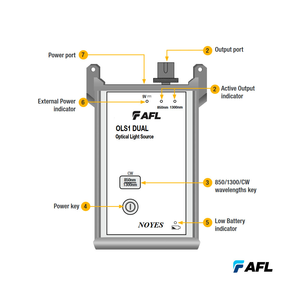 Anhand der einzelnen Leuchtanzeigen sind Power-ON, Akkuzustand, Status, aktiver Ausgangsport, etc... einfach zu erfassen. Mit einem Gewicht von nur 290g ist das OLS1 kompakt und bequem mitzuführen. Mit einer handelstypischen 9V Alkaline Batterie ist das OLS1 von AFL gut 60 Stunden einsatzbereit und funktionstüchtig. Die LED-Ausgänge sind stabilisiert, um hoch genaue Testergebnisse im aktuellen TIA/EIA-Standard sicherzustellen. Die OLS1 Lichtquelle ist vollständig N.I.S.T. konform.