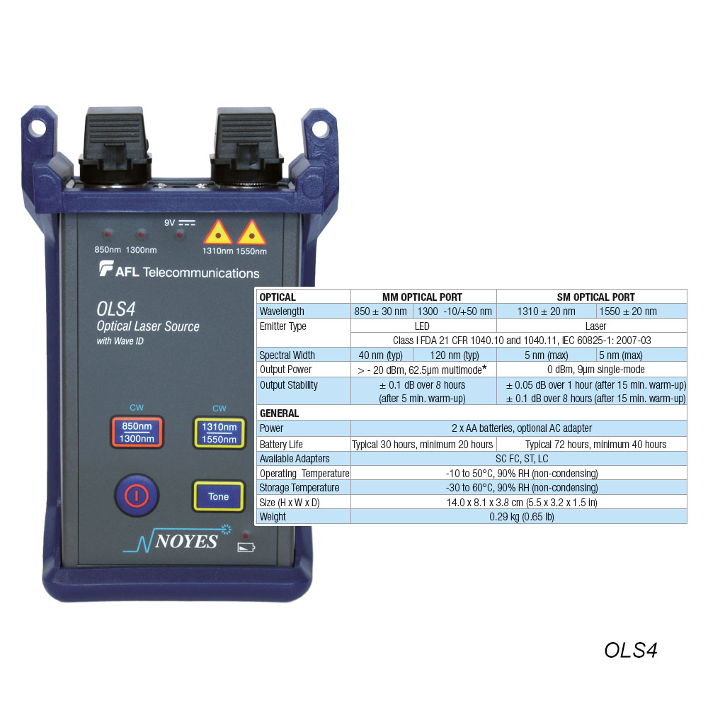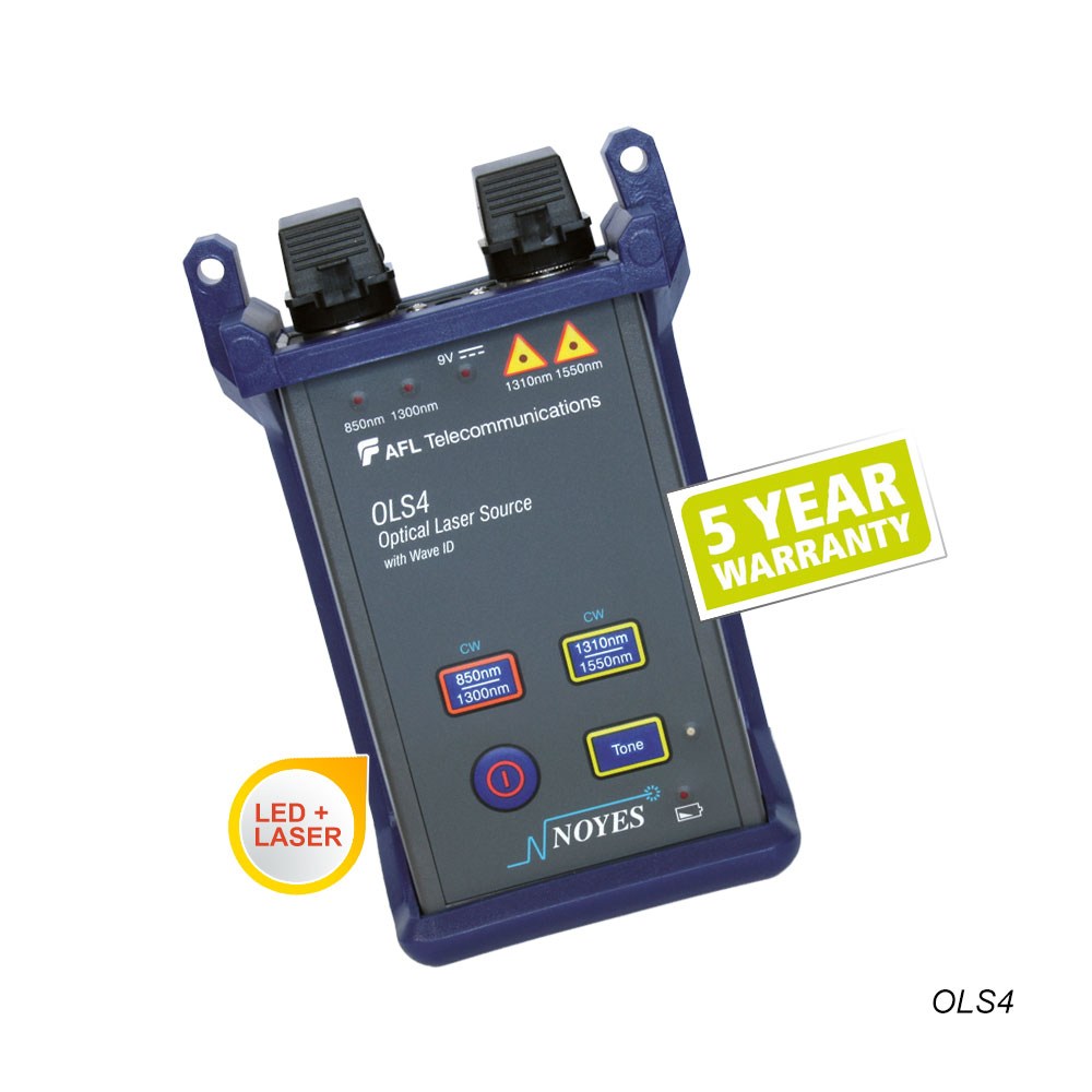 2 Licht-Quellen sowie 2 Ausgänge in einem Gerät und dann immer noch handlich, robust und günstig. Hierbei handelt es sich um das von AFL entwickelte OLS4. Diese Optical Laser Source ist ausgestattet mit zwei voneinander getrennten Lichtquellen. Der LED-Ausgang verfügt über die Wellenlängen 850nm und 1300nm und ist ein Multimode-Ausgang. Der LASER-Ausgang dieses OLS4 verfügt über die Wellenlängen 1310nm sowie 1550nm und ist ein Singlemode-Ausgang. Die LASER-Quelle des Gerätes wird von einem Klasse 1 Laser gespeist.