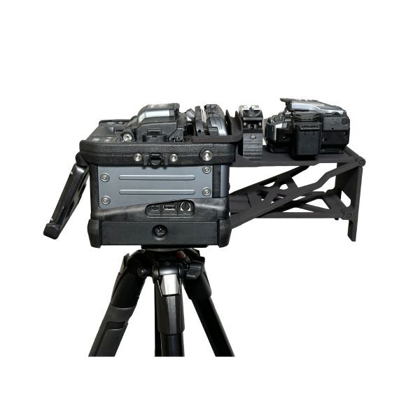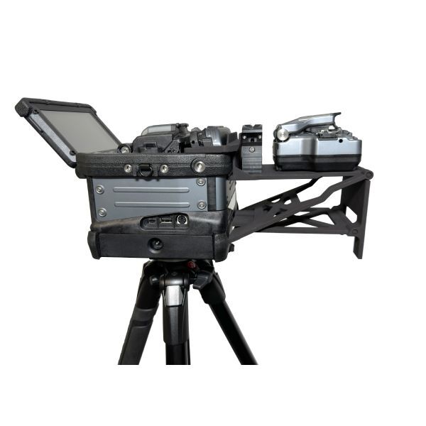 Die neu entwickelte Halterung besteht aus einem besonders leichten Material und lässt sich Dank der zwei integrierten Gelenke einfach zusammenklappen und im Spleißkoffer verstauen. Die Presse und das Trenngerät können dabei montiert bleiben! Alles an seinem Platz!