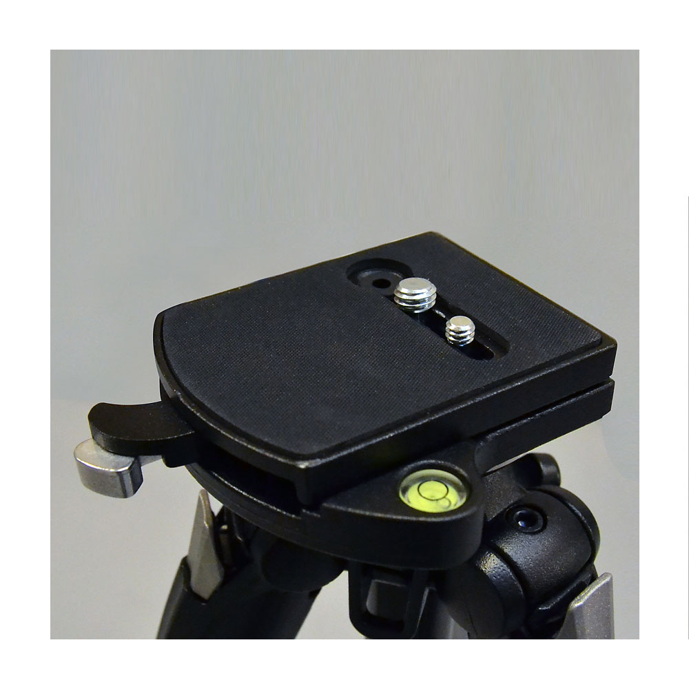 Praktisches Stativ inkl. eines extra breiten Schnellwechsel-Adapters für eine stabile Fixierung. Es ist sehr stabil durch die besonders große Aufnahmeplatte.