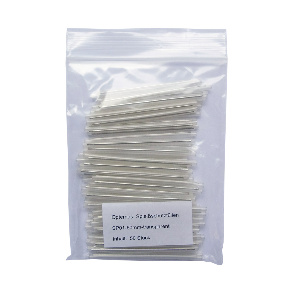 Opternus Schrumpf-Spleissschutzhülsen mit einer Länge von 60mm zum Schutz der gespleissten LWL-Fasern. Die Spleissschutzhülsen sind erhältlich in transparent mit eienr Größe von 2,4mm x 61mm. Inhalt: 50 Stück.
