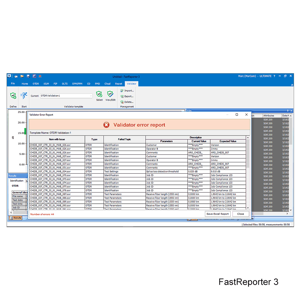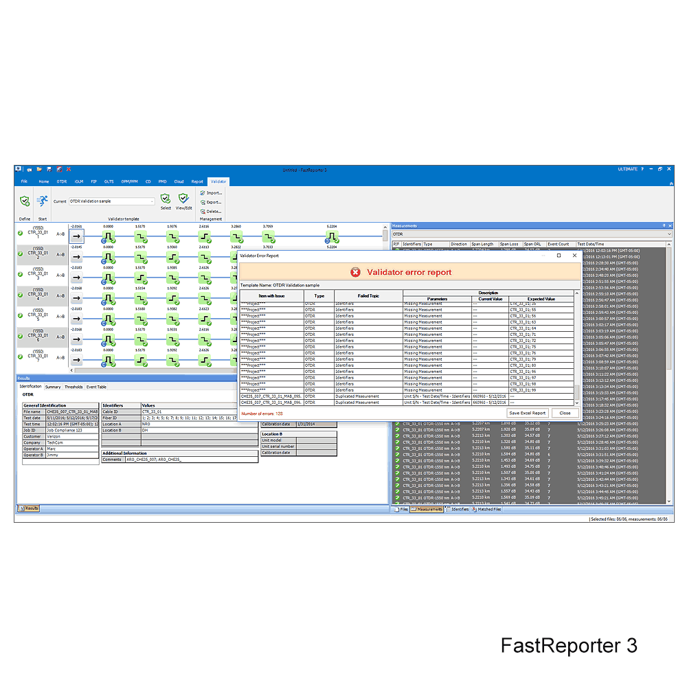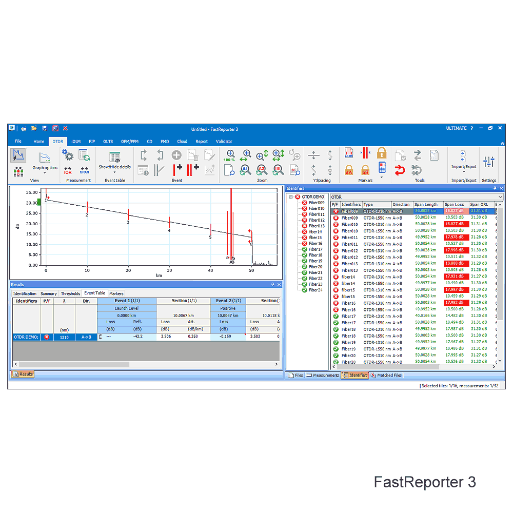 FastReporter3 ™ ist eine hervorragende Softwarelösung mit grafischer Benutzeroberfläche für das Management von OTDR und iOLM-Messdaten sowie für die Erstellung von Berichten inklusive Mikroskop-Bildern und Ergebnissen von OLTS- (Dämpfung/ORL) und bei Bedarf CD-/ PMD-Messungen. Der FastReporter 3 von EXFO wurde für die Offline-Analyse von Felddaten entwickelt, um Effizienz und Produktivität für all Ihre optischen Testanwendungen zu steigern.