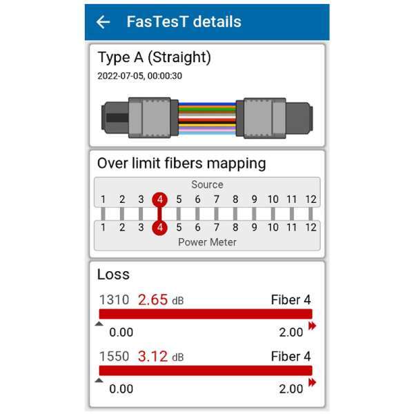 Die FastTEST-Funktion liefert den Verlust pro Kanal bei den 2 ausgewählten WL sowie den Polaritätstyp der zu testenden Verbindung - alles auf Knopfdruck.
