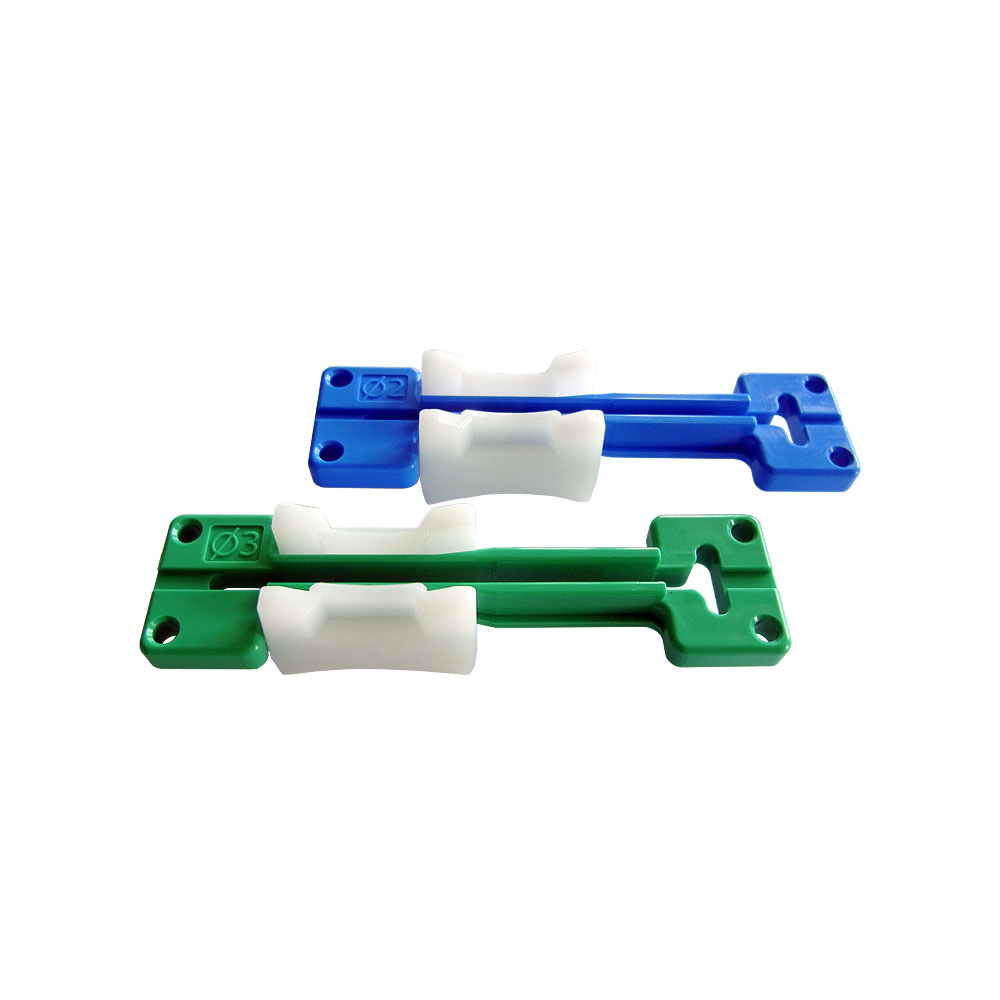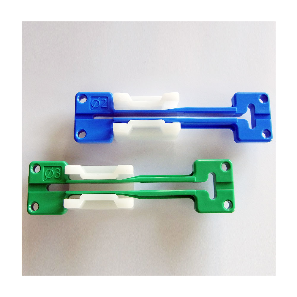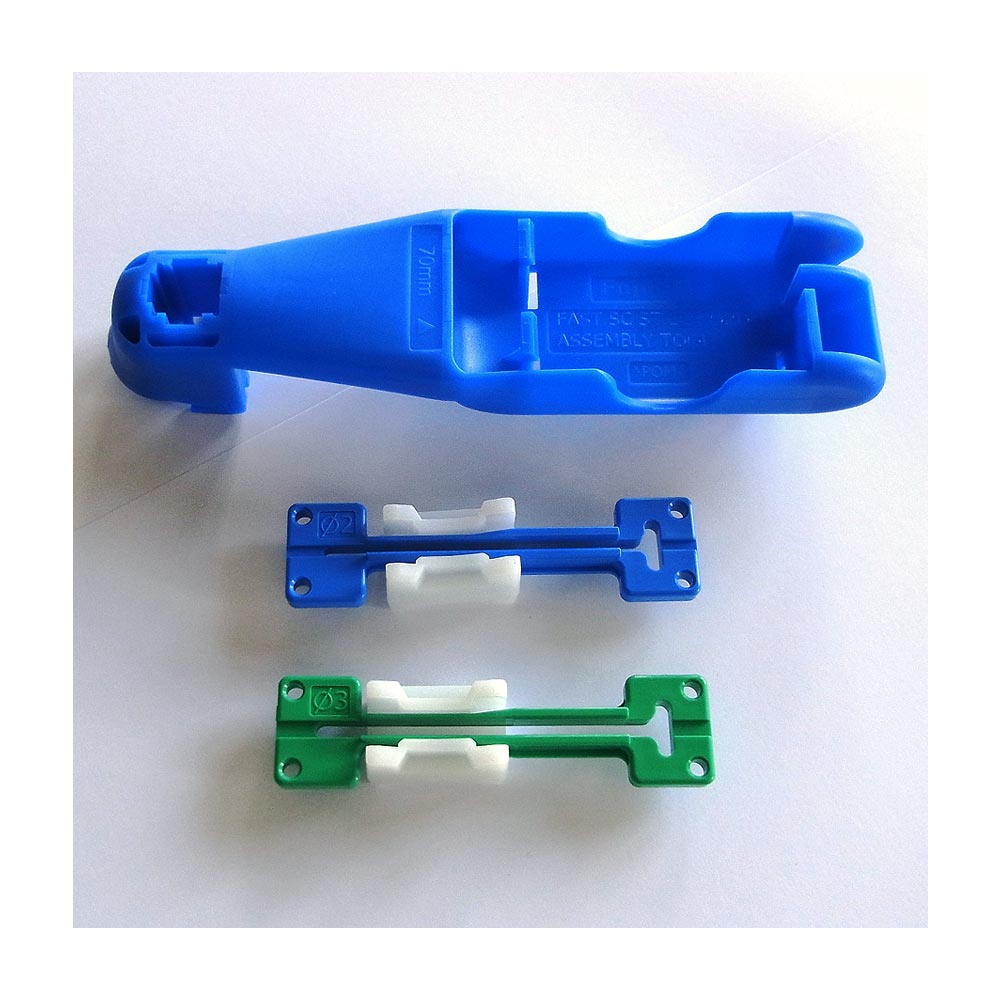 - 1 Tool besteht aus einer Zusammenbauhilfe und einer blauen Kabelführung 2,0 mm (Clamp-FC-20) sowie einer grünen Kabelführung 3,0 mm (Clamp-FC-30)