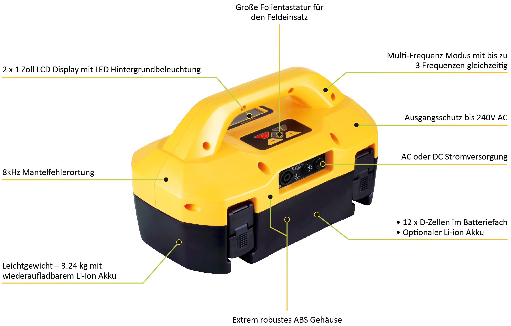 Der 10-Watt-Breitbandsender verfügt über wählbare Induktions- und Direktanschlussfrequenzen von 98Hz bis 200kHz, SD-Modus (Signal Direction), Fehlersuche und echte Widerstandsmessung bis zu 1 Mohm. Das 2-Zoll-Display mit LED-Hintergrundbeleuchtung zeigt Ausgangsstrom, Anschlussart, Spannung, Widerstand, Frequenz, Lautstärke, Batteriezustand und Hochspannungswarnungen an.